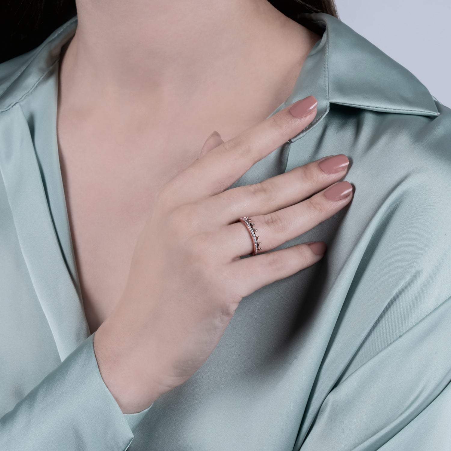 A gorgeous gift to the queen of your heart, this tiara ring from Enchanted Disney Fine Jewelry showcases a timeless royal beauty. The ring features exquisite metalwork and a dazzling sparkle. This ring is crafted in 10k rose gold and embellished with 1/10 CTTW of diamonds. This Majestic Princess Tiara Ring is the perfect choice to honor your royally epic journey in finding love and living your happily-ever-after.