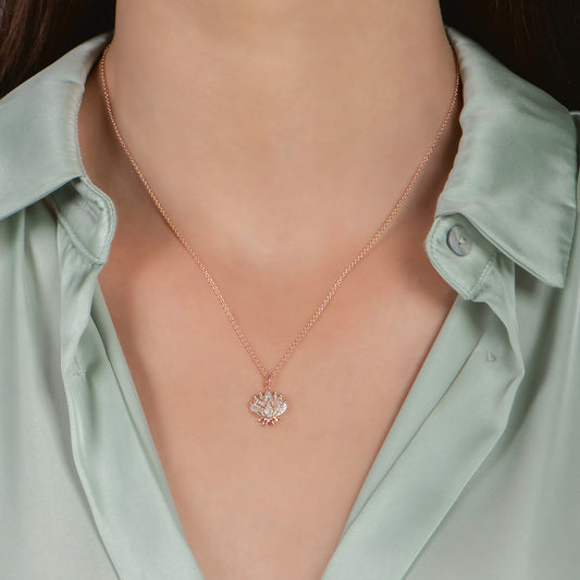 Mark a new beginning with a glittering token in the form of this Enchanted Disney Fine Jewelry 14K Rose Gold Over Sterling Silver 1/5 CTTW Jasmine Lotus in Heart Pendant Necklace. Designed with a sculpted lotus flower that symbolizes rebirth, transformation, and growth, this necklace is a fitting mark for a major life milestone. Celebrate the change with this dazzling jewel that will further inspire you to discover and pursue new horizons.