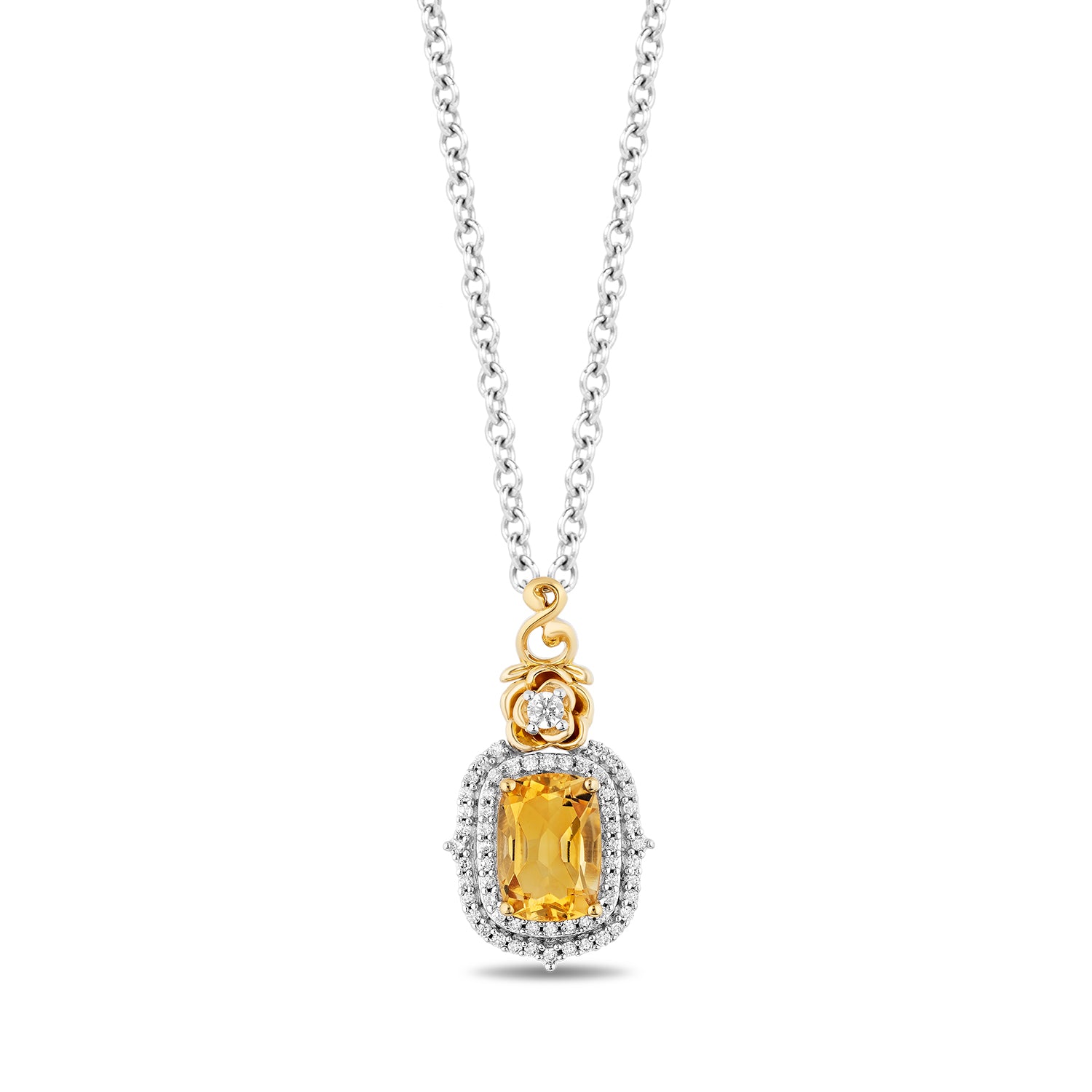 Adorn yourself with the warmth and radiance of the Enchanted Disney Belle necklace. In 14K yellow gold over sterling silver, adorned with 1/6 ct.tw. diamonds and a captivating citrine, this necklace embodies the grace and luminosity found in Belle's enduring love for the enchanted rose.