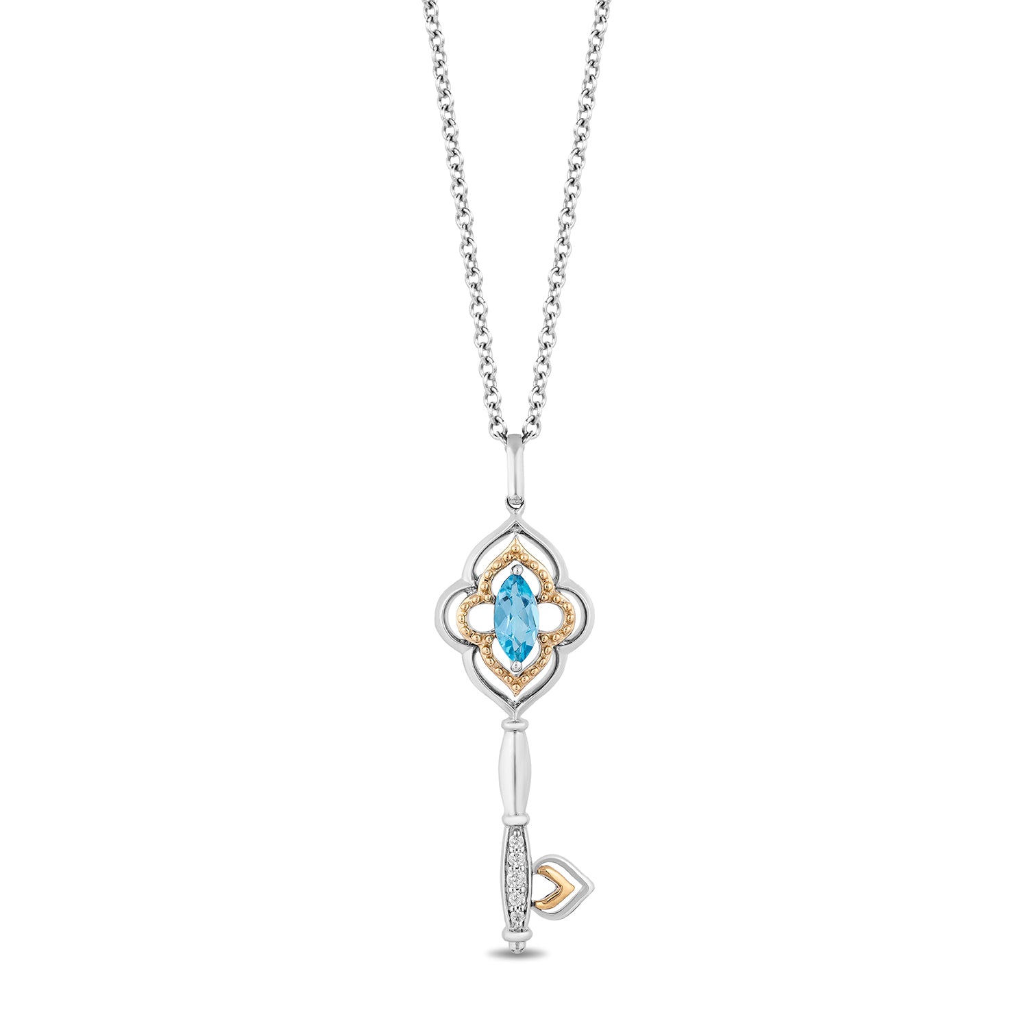 This seems to be the key that would open the door to your new fashion style. Inspired by Disney Princess Jasmine, this sterling silver and 10k yellow gold necklace in the shape of a key brilliantly shine with magical charm. On its center is a marquise-shaped Swiss blue topaz gemstone while on its tip are five round diamonds. The gorgeous necklace suspends from an adjustable 18-inch cable chain in sterling silver.