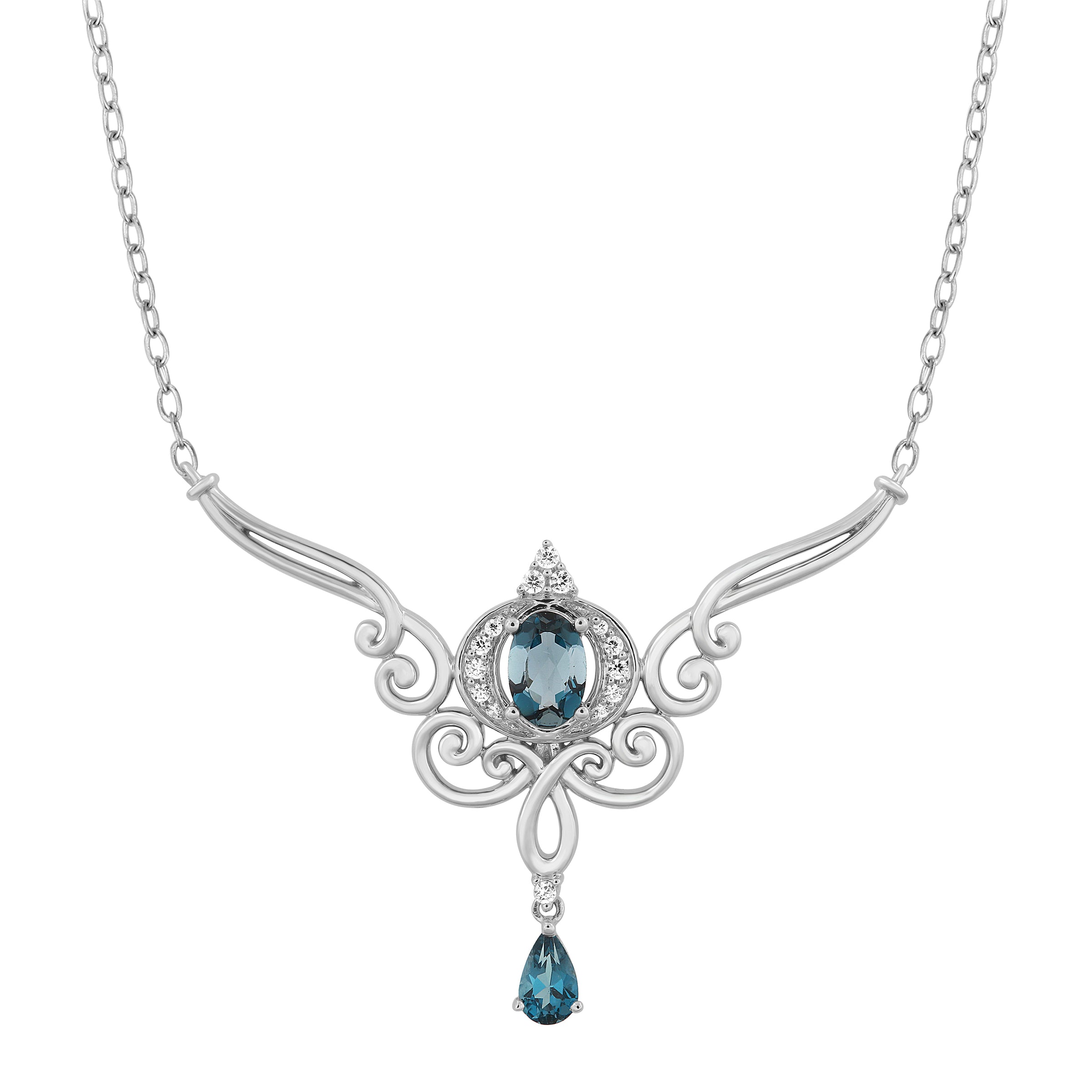 Step into a world of enchantment with our Cinderella necklace, a regal creation in sterling silver adorned with diamonds and a captivating London blue top...