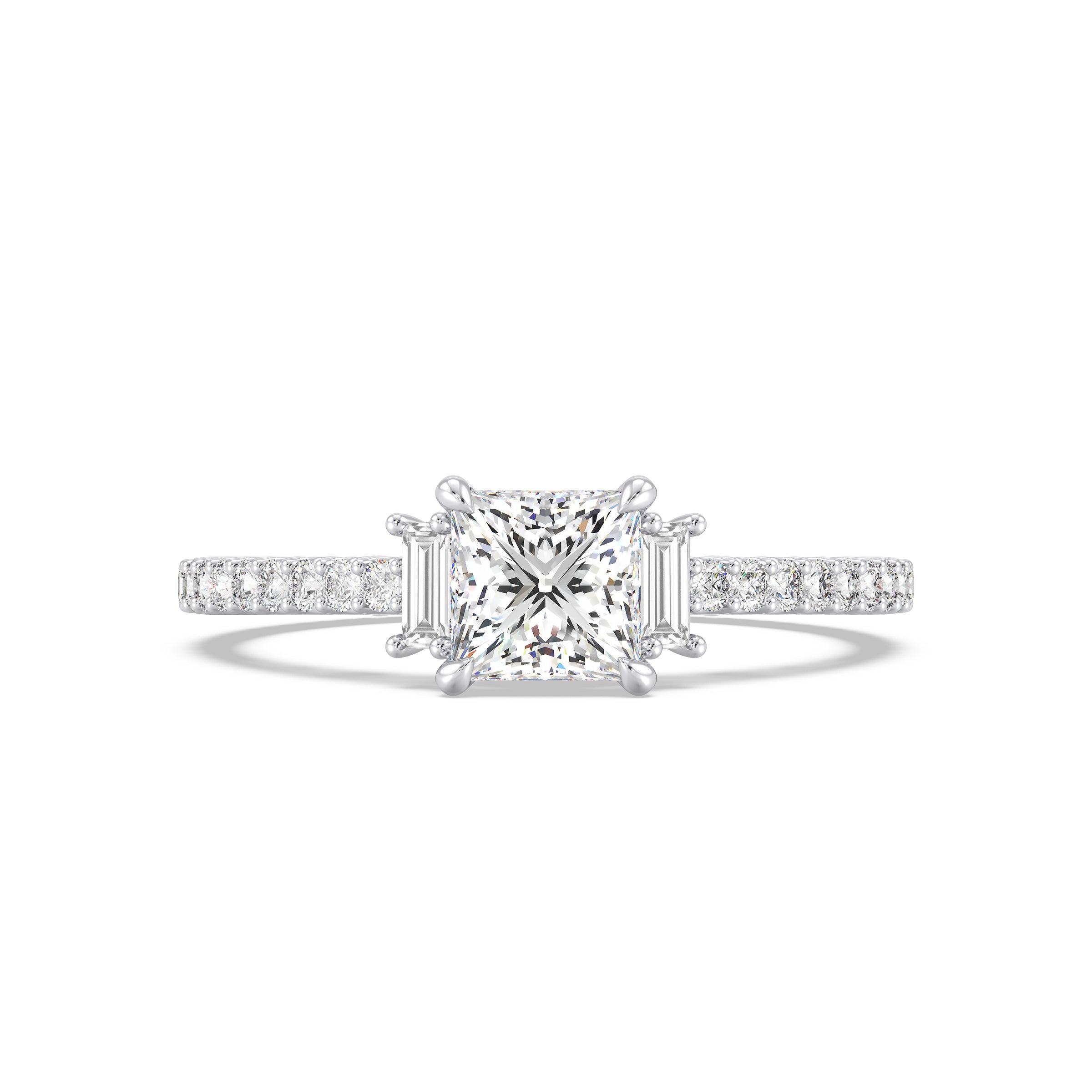 Inspired by Disney Princess Belle’s love for beauty found within, this Enchanted Star engagement ring features a radiant princess-cut lab grown diamond that captures light with every angle. Beneath the center stone lies a delicate hidden halo—an elegant detail that adds depth and sparkle without overpowering the clean, modern lines of the design. Tapered baguette side stones and a diamond-accented band enhance the ring’s refined silhouette, all crafted in polished 14K white gold. Classic, graceful, and thoughtfully detailed, this piece reflects Belle’s timeless charm and the quiet strength of a love that grows brighter over time.