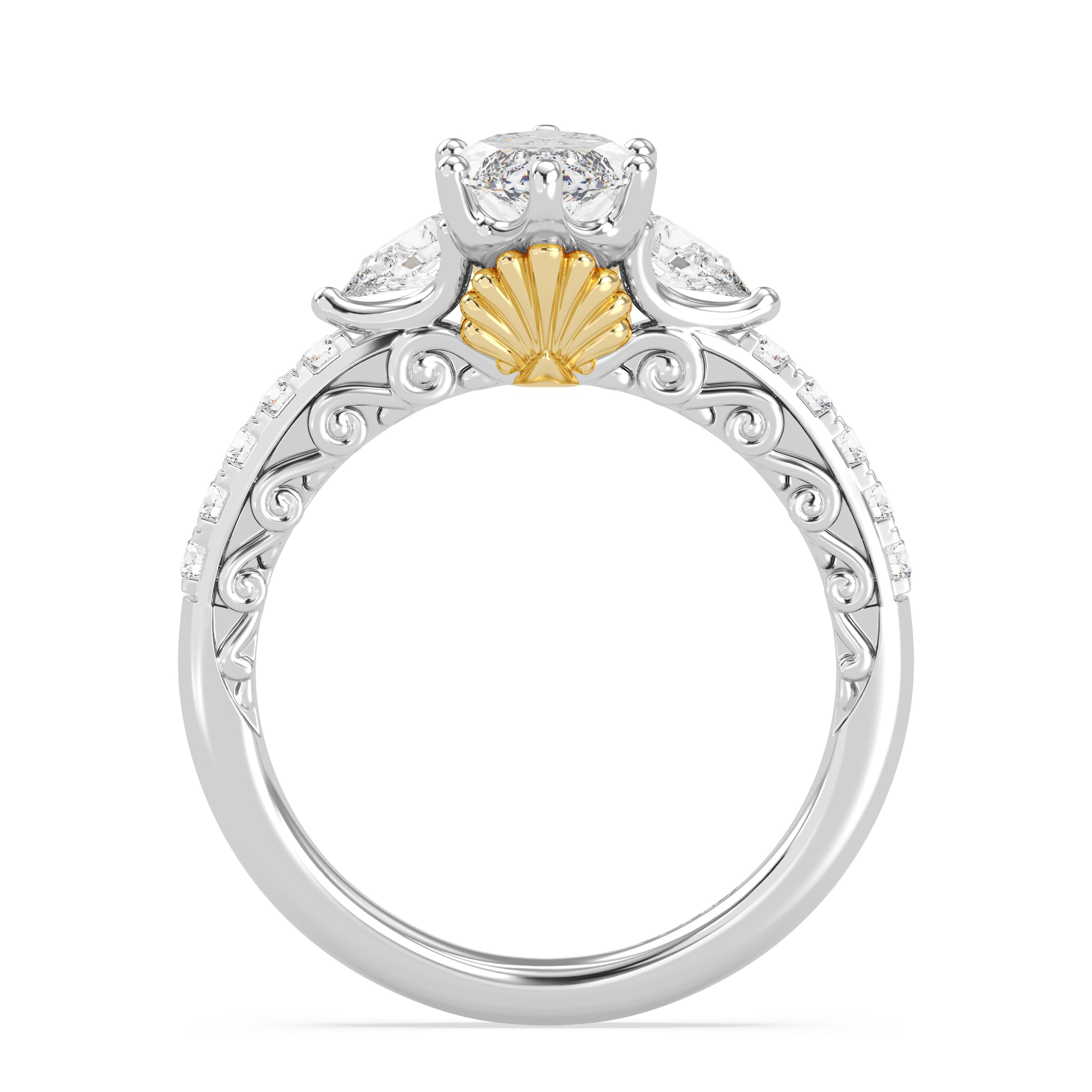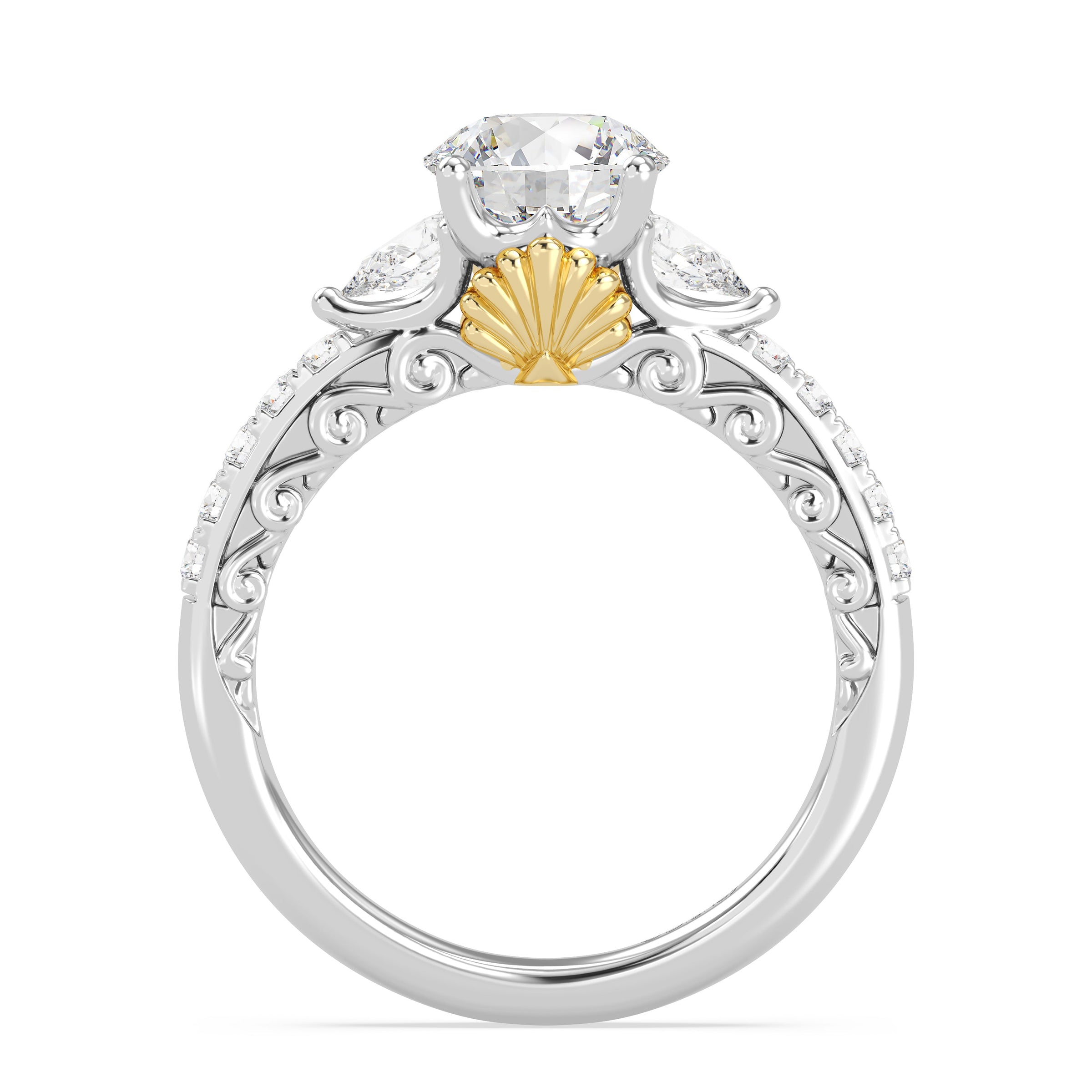 Inspired by Ariel’s love for the sea, this engagement ring features a radiant lab grown diamond embraced by her icon- sea shell, in the gallery in 14K gold. Diamond accented band sweeps gracefully toward the centerpiece, creating fluid lines reminiscent of ocean waves. A design that balances whimsy and elegance, perfect for someone who treasures beauty and individuality.