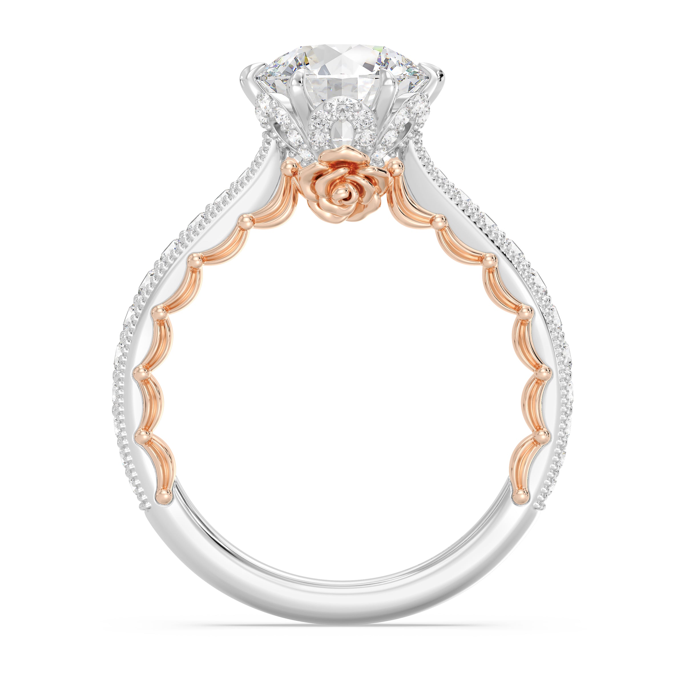 Elegant and timeless, this vintage-inspired ring features a brilliant lab-grown center diamond set above a refined split shank. Intricate detailing and warm touches of rose gold bring a classic, romantic charm—perfect for someone who admires grace, refinement, and old-world beauty.