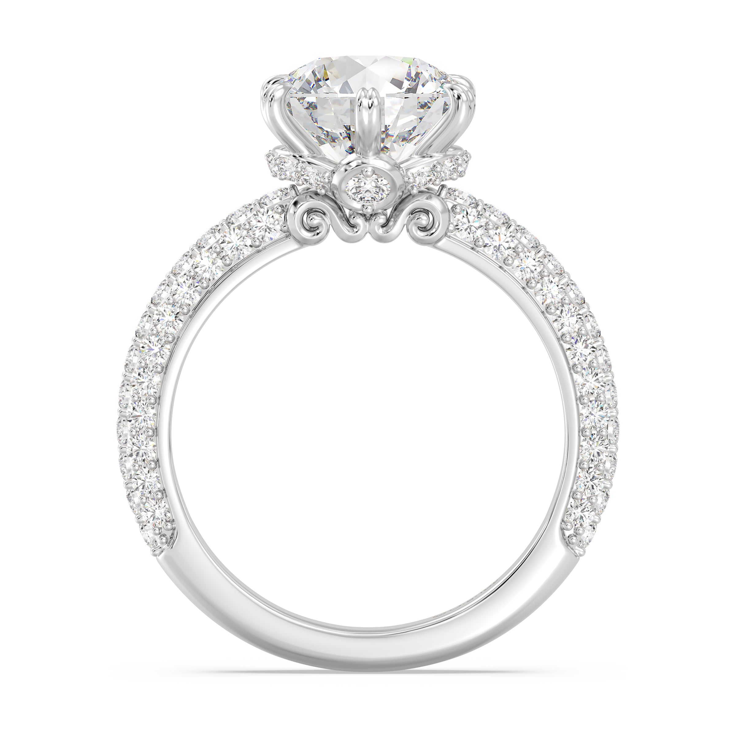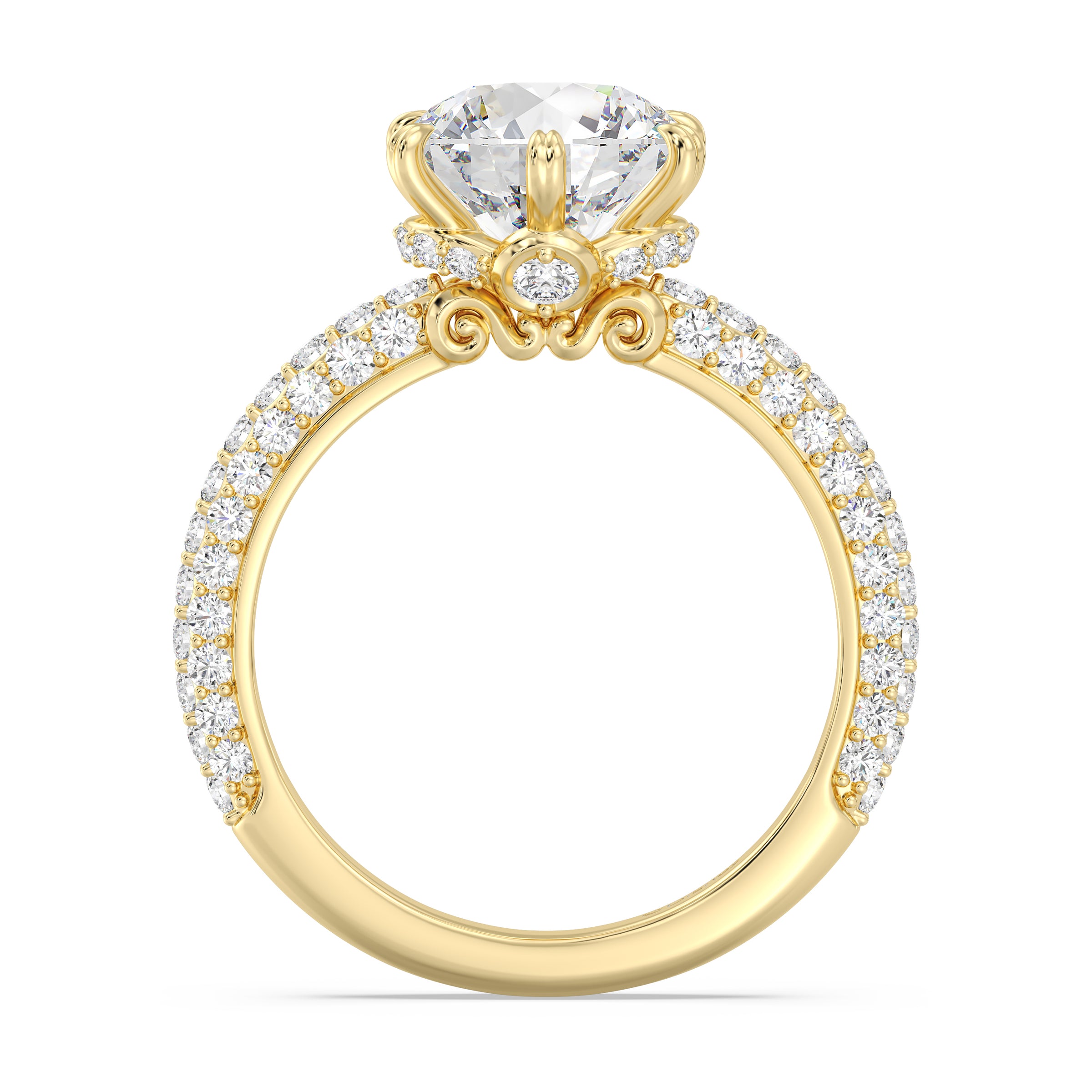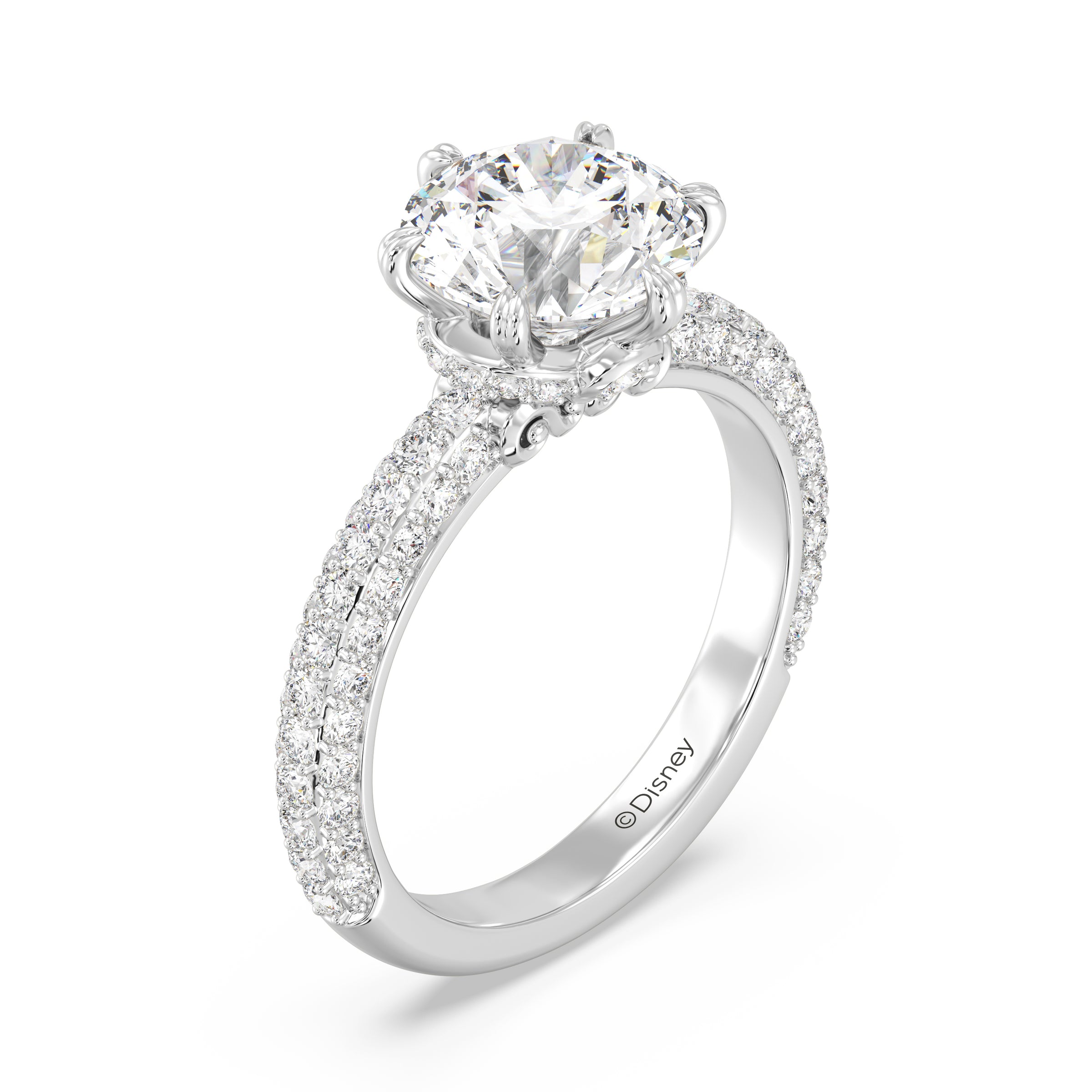 Dreams really do come true with this breathtaking 14K gold engagement ring. Inspired by Disney princess Cinderella, the design captures the enchantment of a midnight transformation. A magnificent round brilliant lab grown diamond takes center stage, held by a regal six-prong setting. The band is a shimmering spectacle, featuring rows of pavé-set diamonds that glitter like a glass slipper. The true wonder is hidden in the profile: an intricate under-halo scroll design, reminiscent of the iconic pumpkin carriage, cradles a secret bezel-set diamond just beneath the center stone.