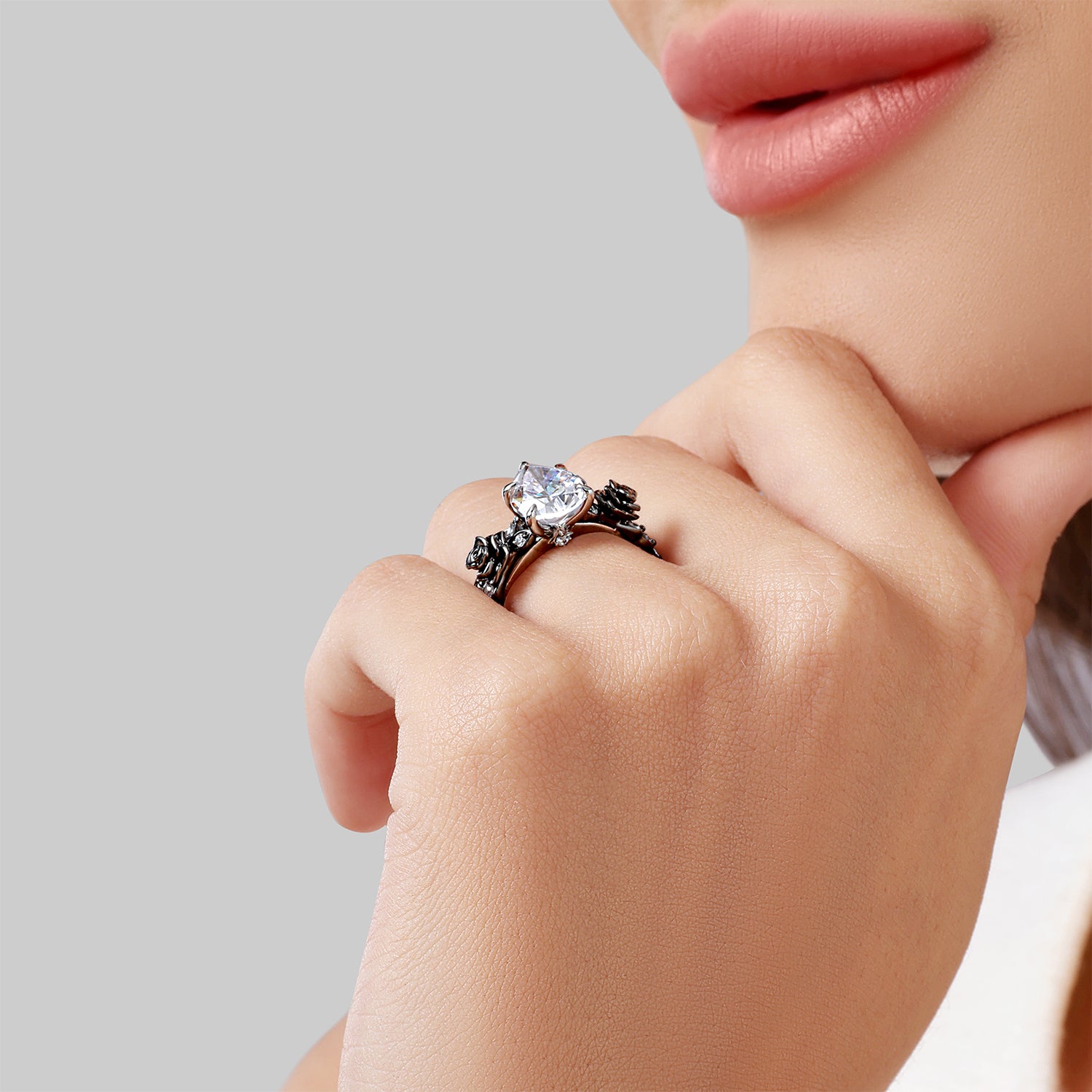 An Ideal for a bride-to-be with a bold sense of style, this engagement ring duo draws inspiration from Maleficent's captivating allure. The set includes two distinct rings designed to make a statement. The first ring features a pear-cut lab-grown diamond at its center, securely held by four prongs. Intricately designed roses in black rhodium adorn either side of the central gem, set on elevated sides embellished with pave-set lab diamonds. The second band complements this unique design with its own array of smaller lab diamonds, enhancing the set's overall elegance and sophistication.
