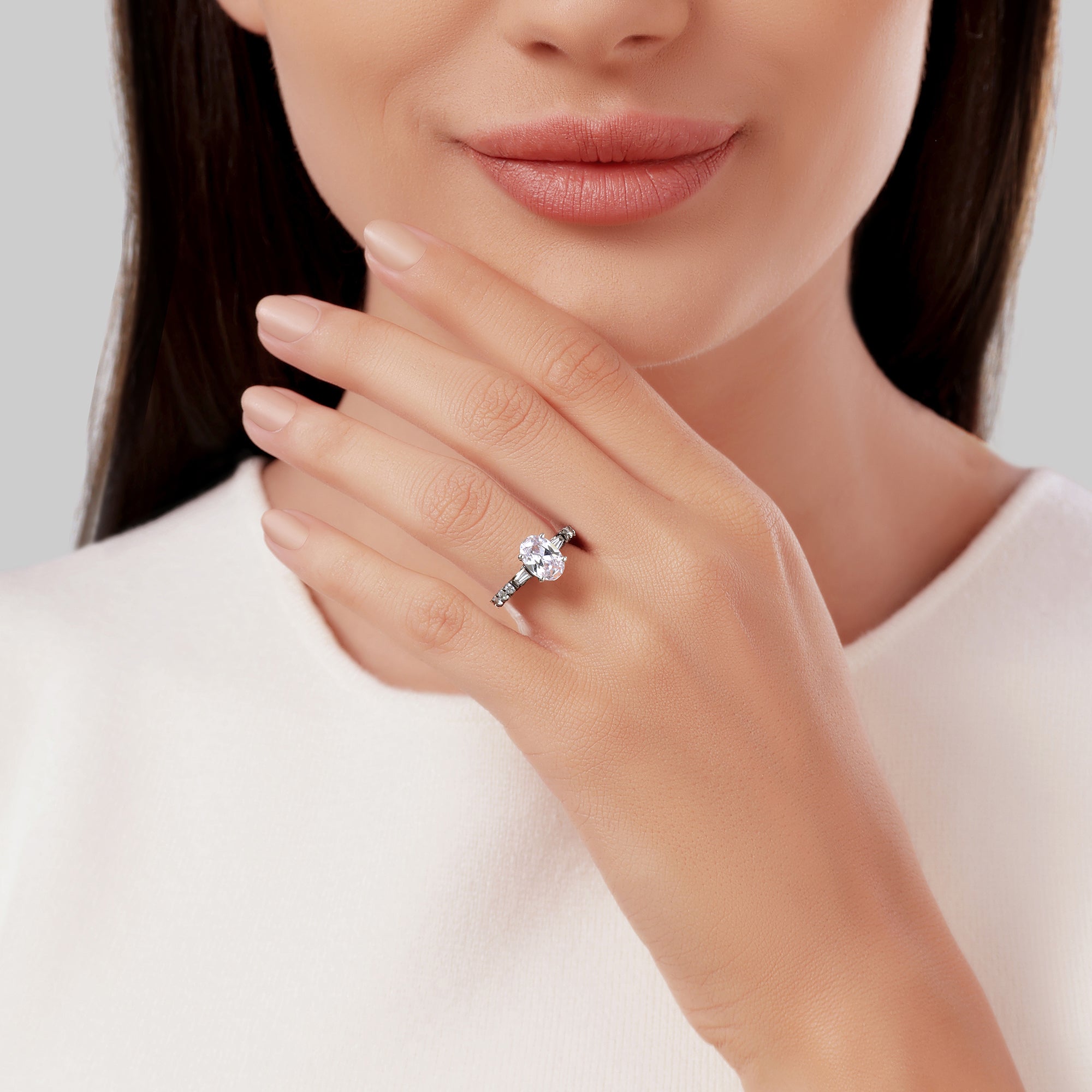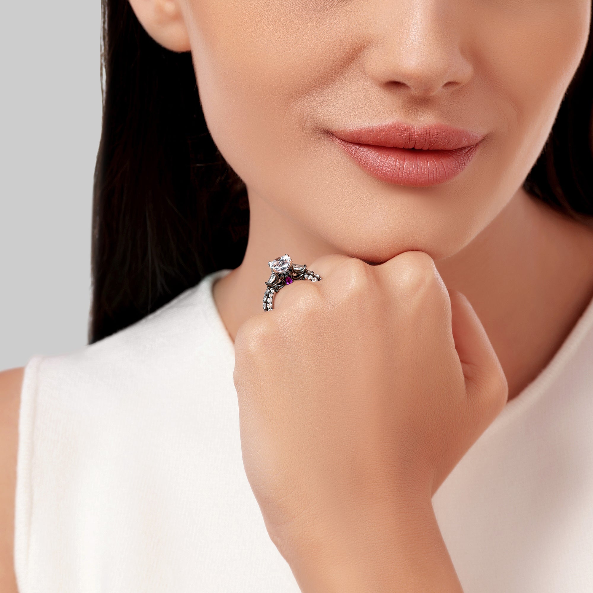 Delve into the depths of enchantment with our Ursula inspired lab grown diamond engagement ring, that mirrors the mystical allure of the sea witch. An oval lab grown diamond in the center, radiates a sense of grandiosity and power. Flanked by stones on each side, this trio of gems creates a symphony of brilliance, capturing the essence of Ursula's manipulative charm. The shoulders are adorned with white diamonds set against a black rhodium backdrop, reminiscent of Ursula's iconic tentacles. As you peer into the gallery beneath the center stone, a regal purple amethyst emerges, adding a touch of royal elegance to the ring.