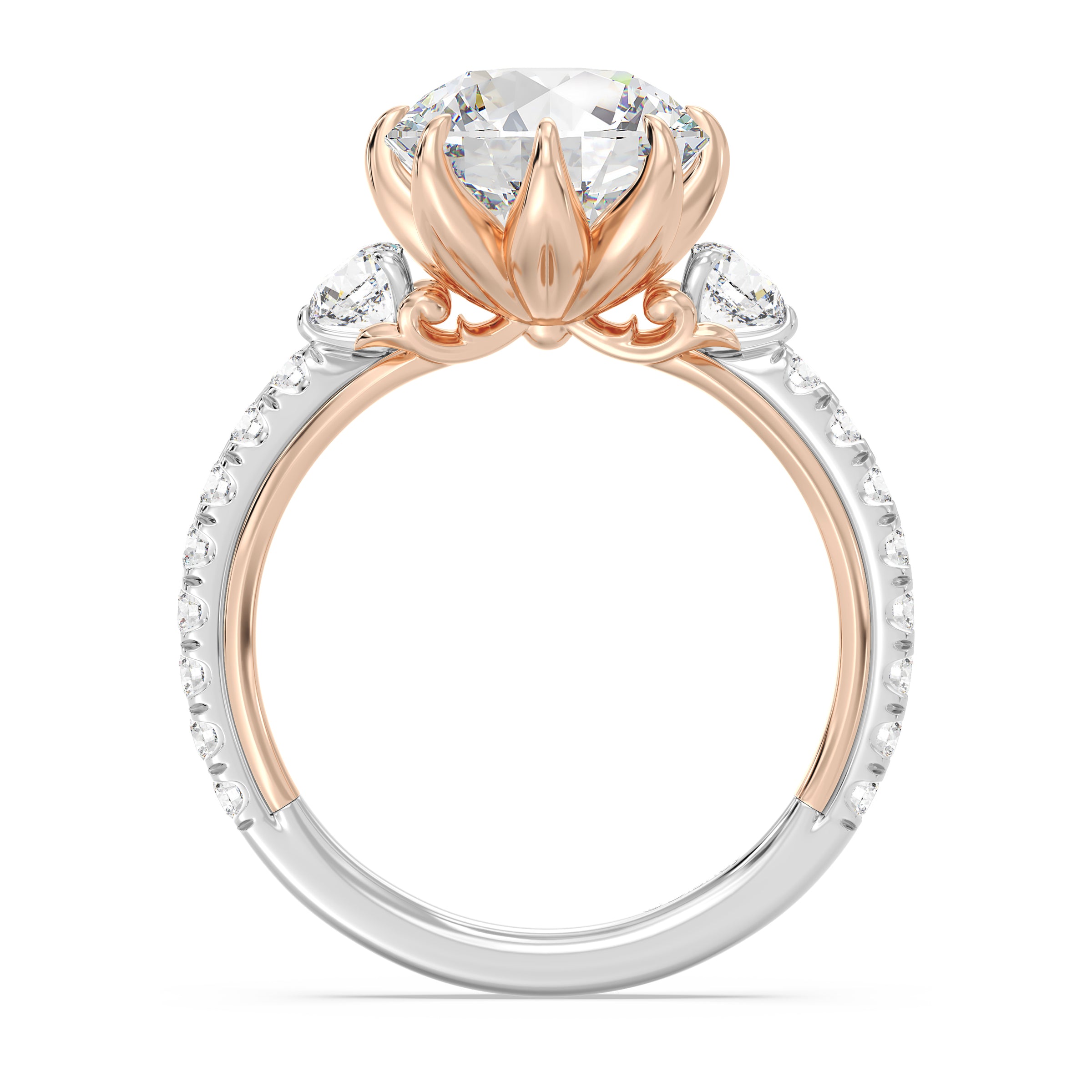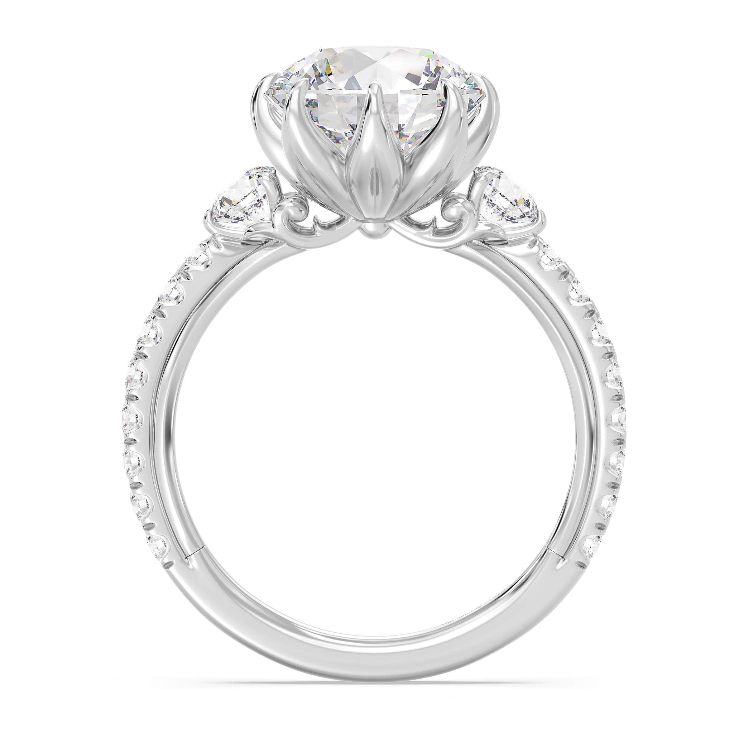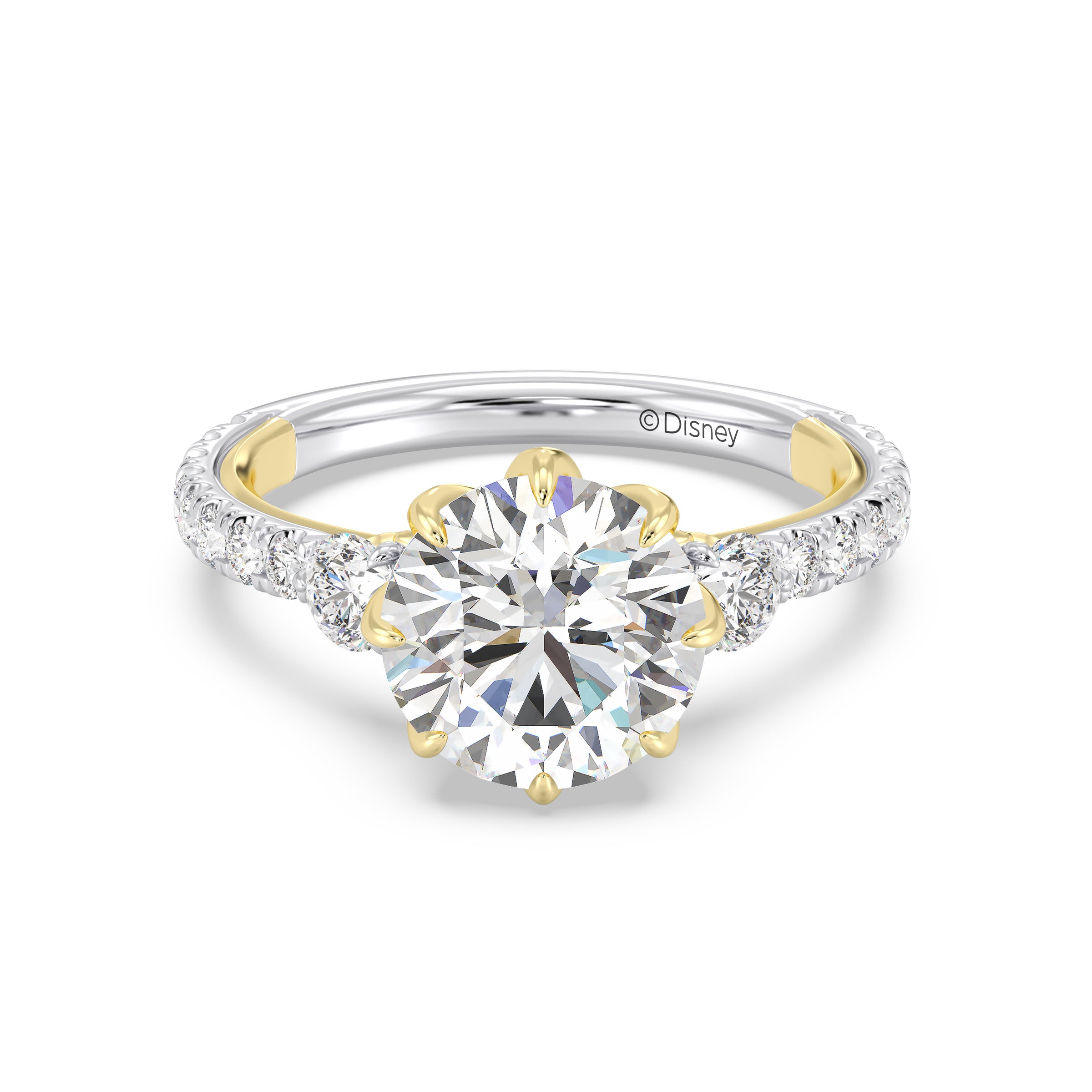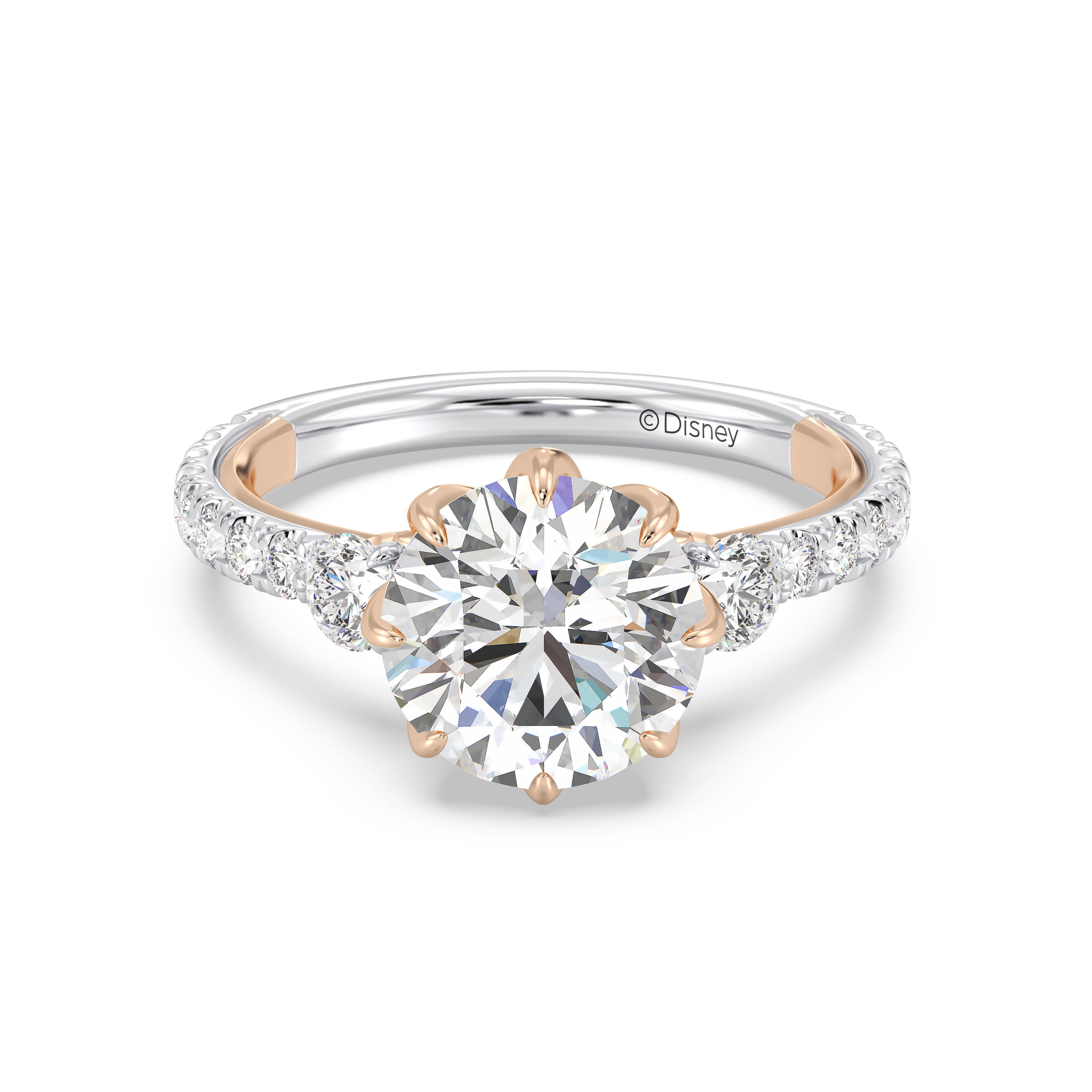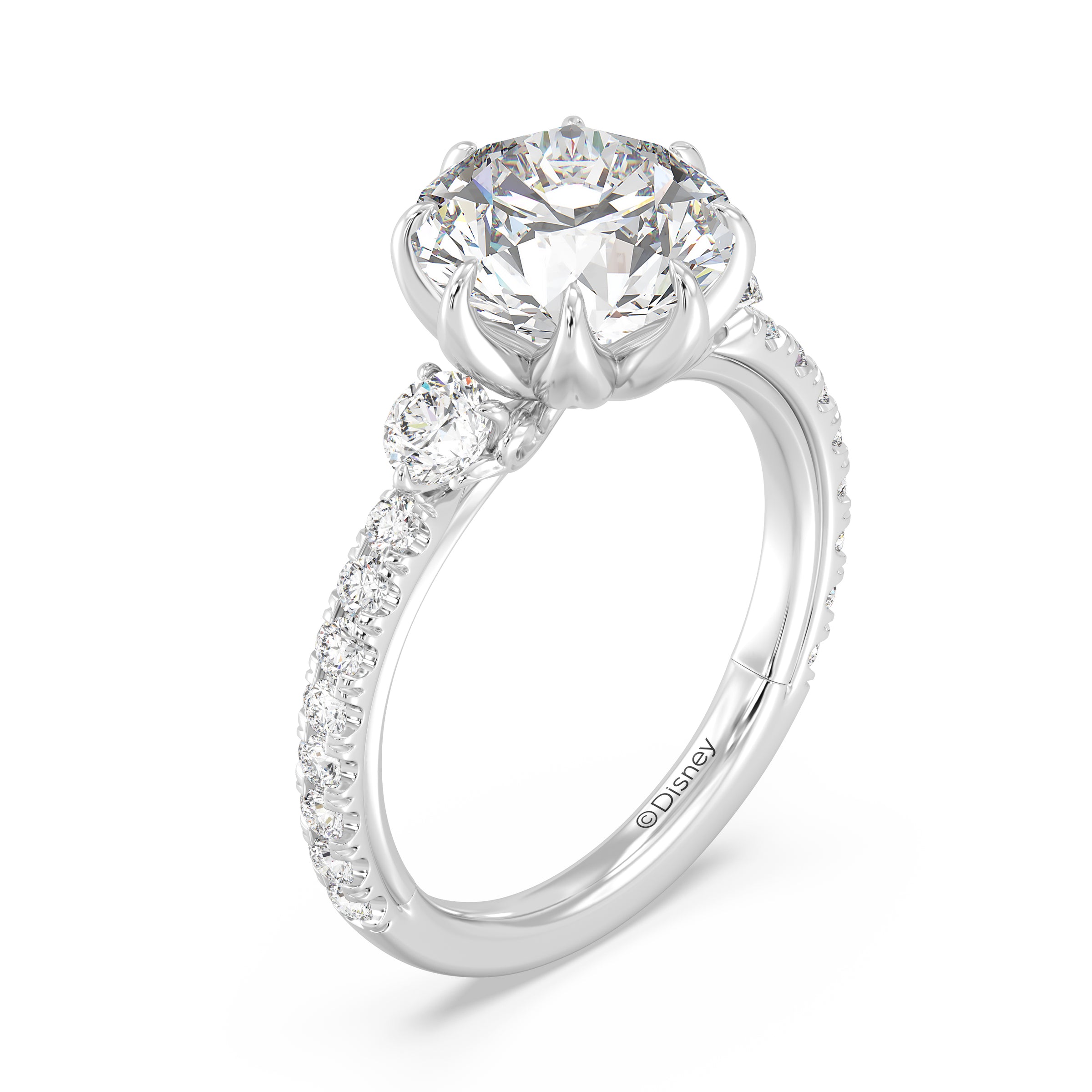 Elevate your moment with Disney Princess Jasmine inspired three-stone engagement ring, featuring a lab grown diamond accented by shimmering round side stones. A pavé-set shank adds brilliance from every angle, while the lotus-inspired basket brings a distinctive touch of elegance and character. A luminous design that beautifully reflects strength, grace, and timeless romance.