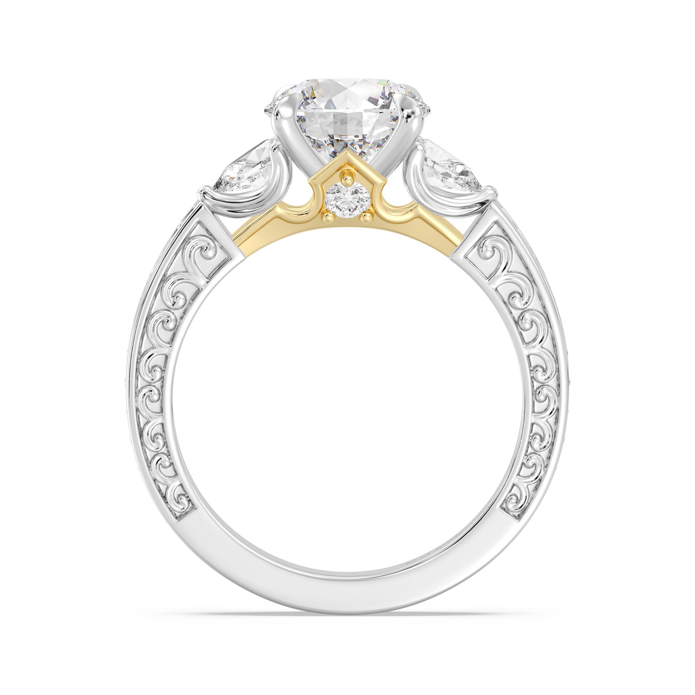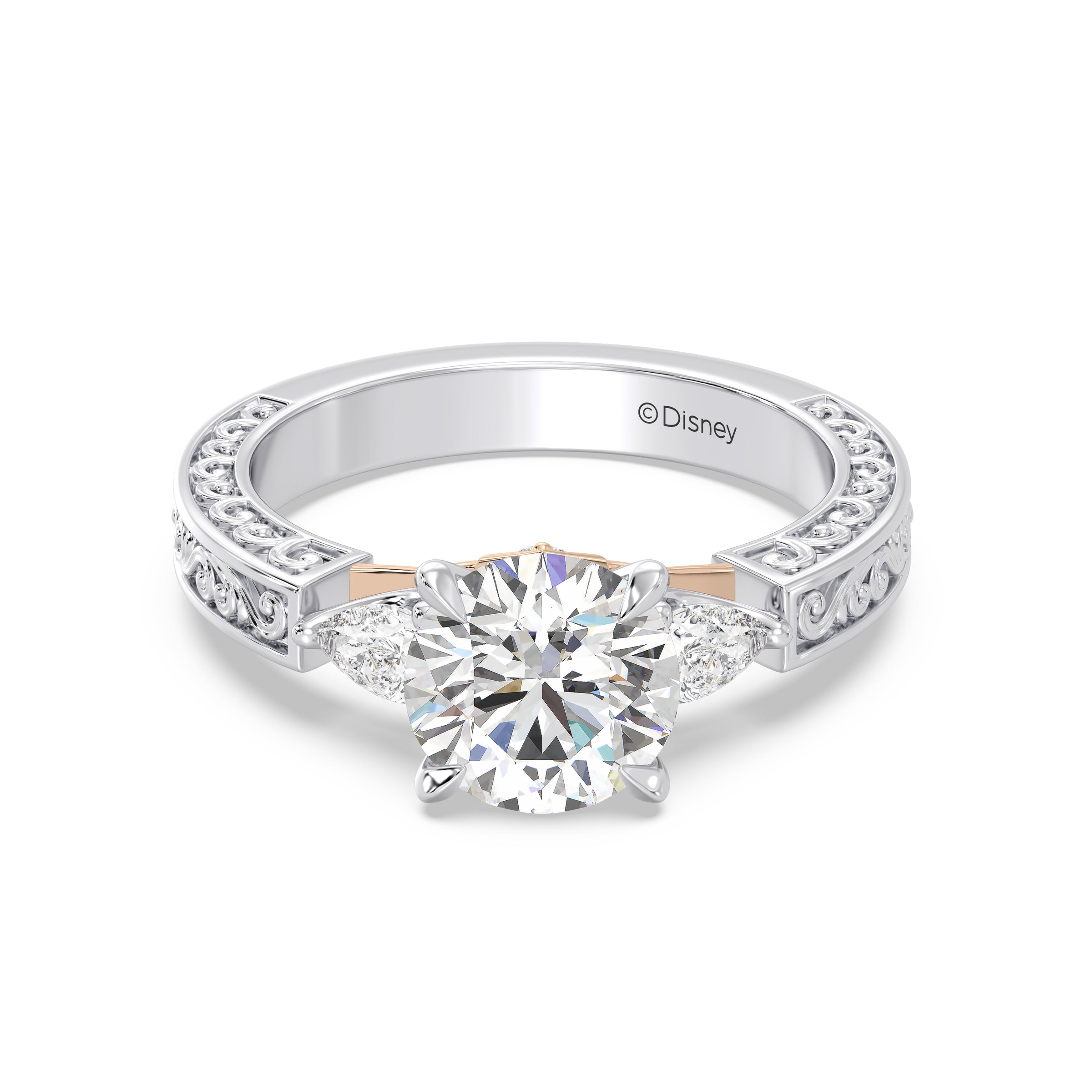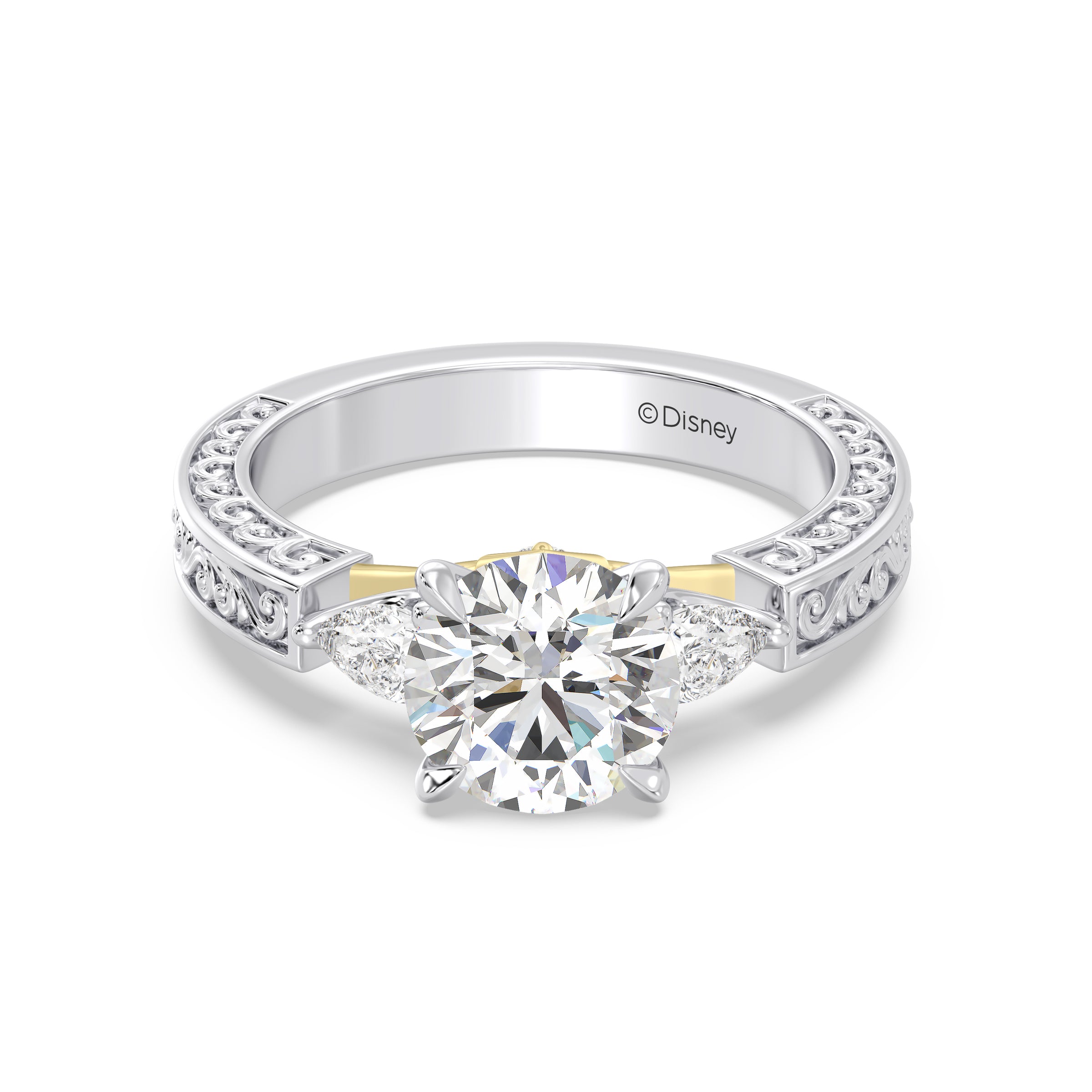 Three luminous lab grown diamonds take center stage in this Disney Princess Aurora inspired engagement ring, creating a classic and meaningful silhouette. The band is enhanced with ornate filigree detailing, crafted in warm 14K gold to evoke vintage elegance. A design rich in craftsmanship and sentiment, perfect for a love that feels timeless.