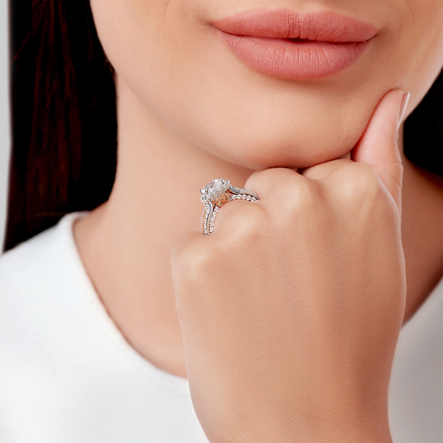 Embark on a journey into enchantment with our Aurora-inspired engagement ring. At its center shines a luxurious cushion-cut lab-grown diamond, encircled by a dazzling halo that symbolizes the eternal radiance of true love. The shoulders of the ring feature two rows of diamonds, framed by strips of lustrous. Below the center diamond, the gallery cradles a miniature replica of Aurora's iconic tiara, crafted in gleaming. Designed for the modern-day princess, this ring encapsulates the essence of Aurora's timeless beauty and elegance.