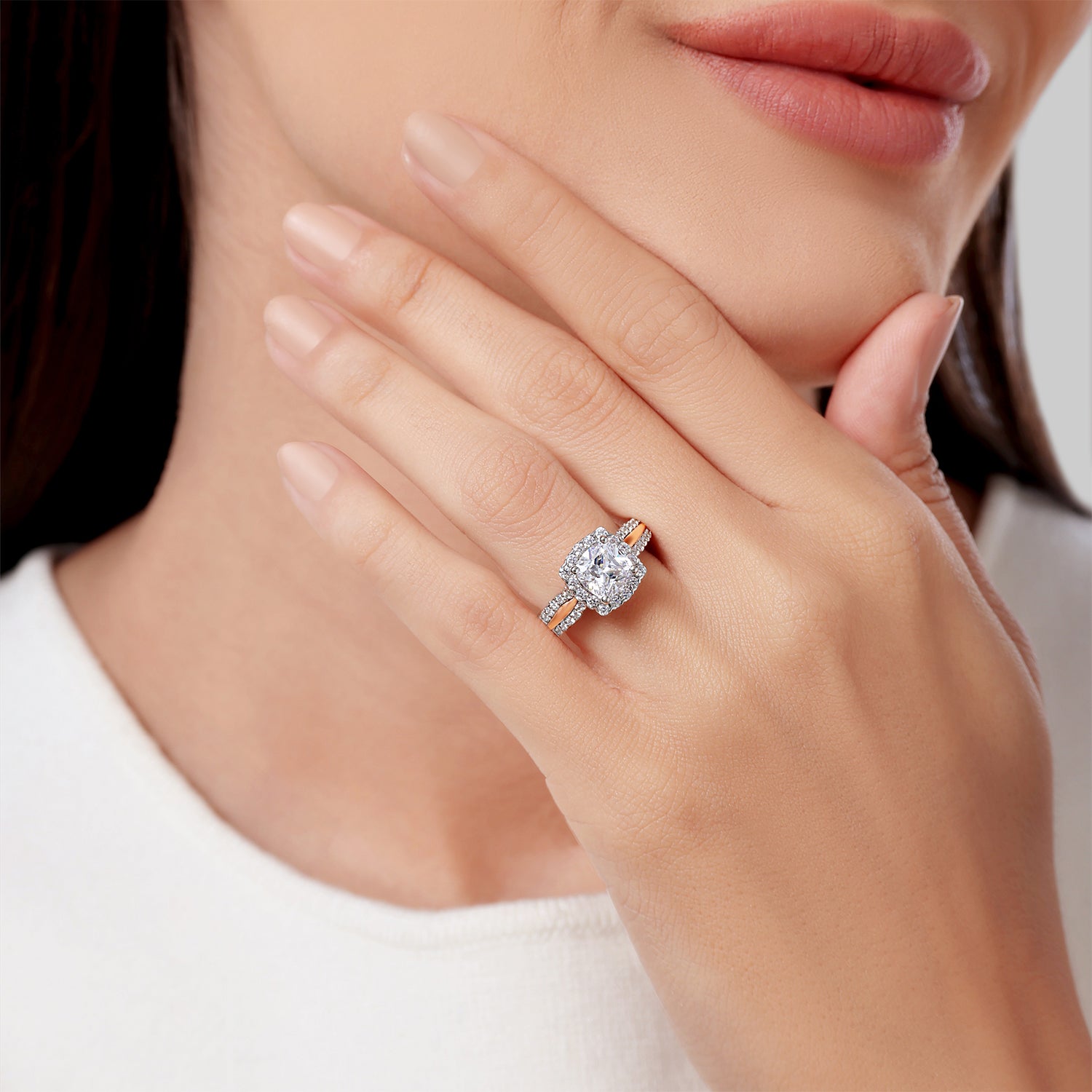 Embark on a journey into enchantment with our Aurora-inspired engagement ring. At its center shines a luxurious cushion-cut lab-grown diamond, encircled b...