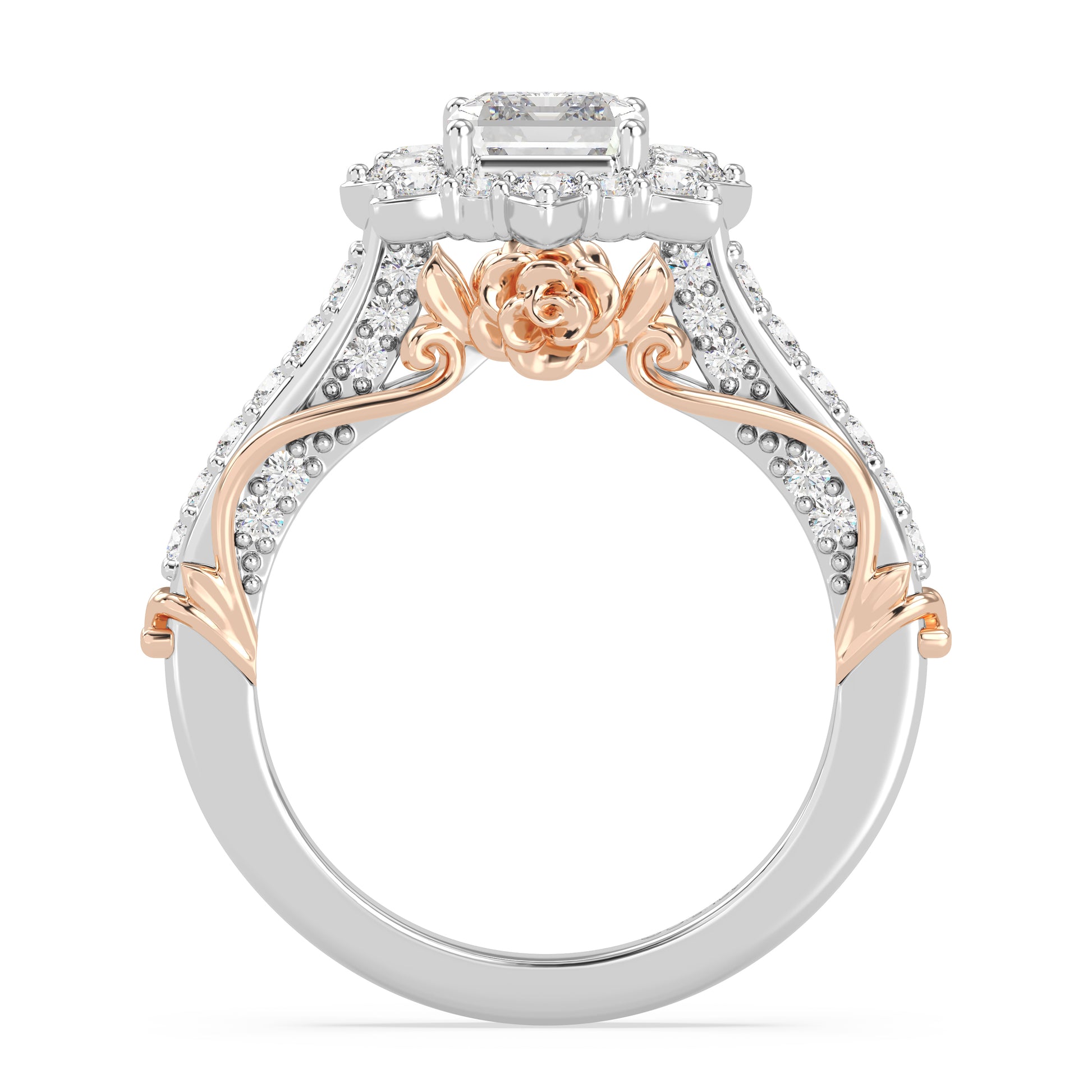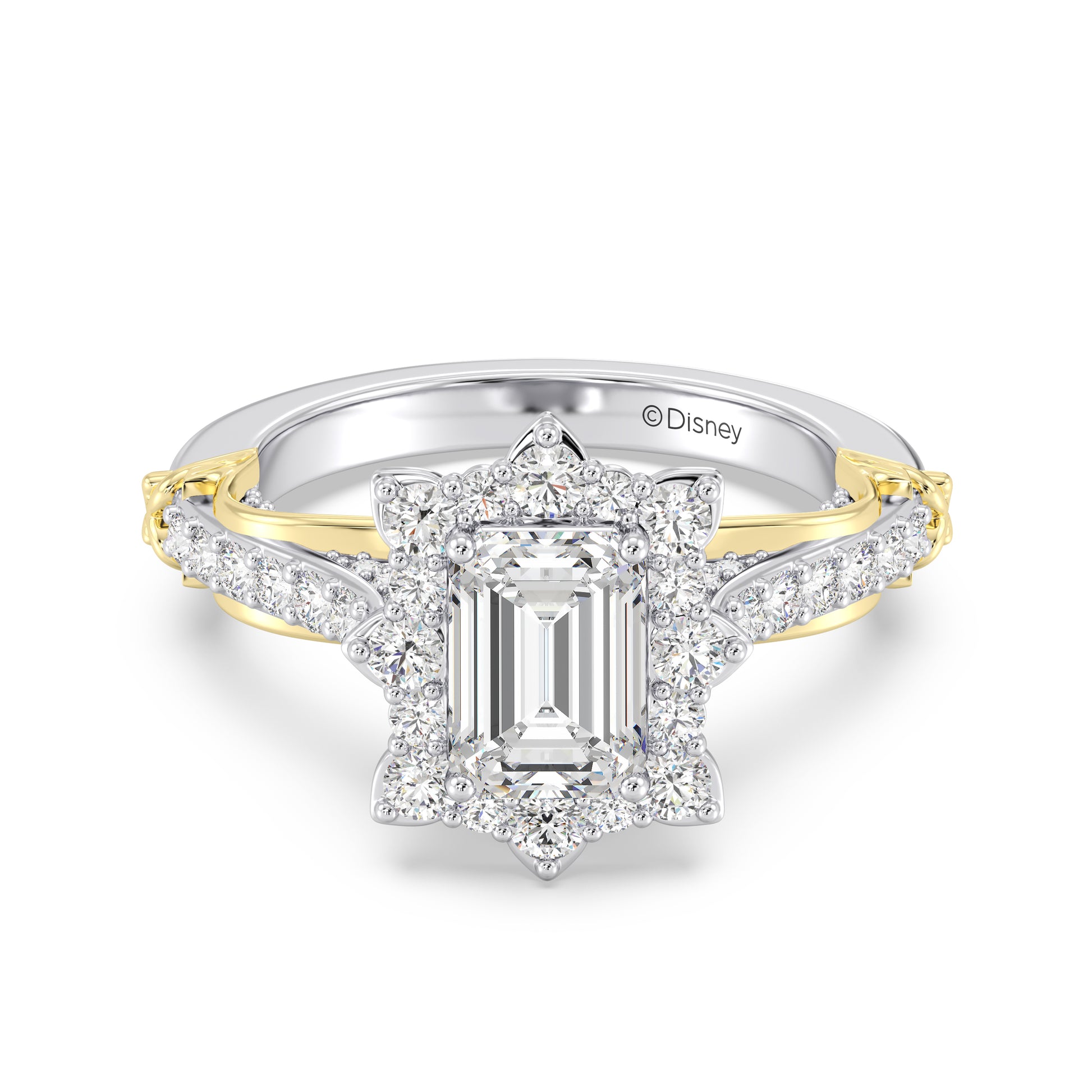 She is an individual. She would never conform. Maybe she's just like Belle, and this ring is perfect for her. Inspired by the tale of Beauty and the Beast, this distinctive ring is adorned with a sculpted rose on its gallery, shaped after the mystical flower in the story. The band's shoulders glitter with lab-grown diamonds and lead to a central gem encircled by a sunburst halo of more lab-grown diamonds.