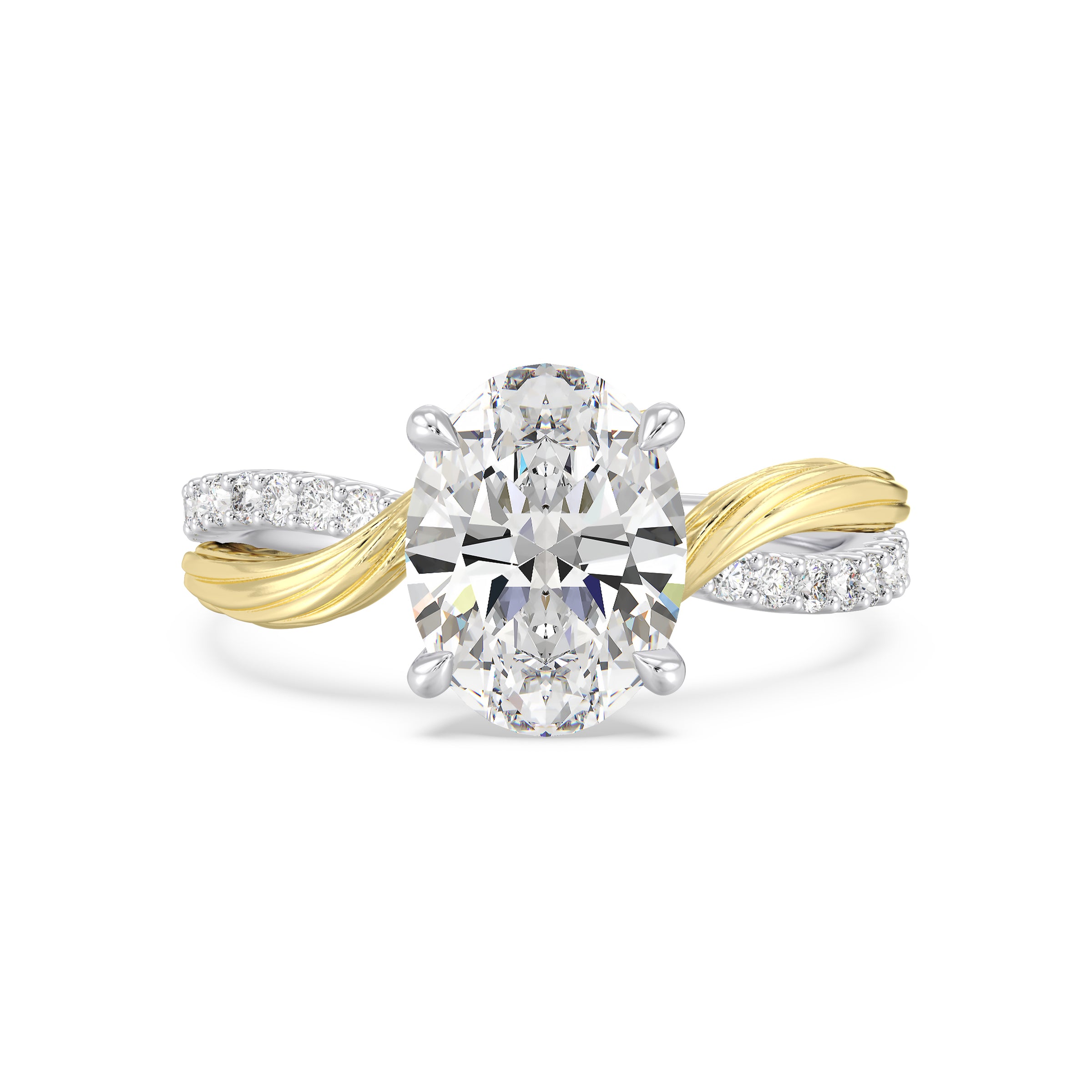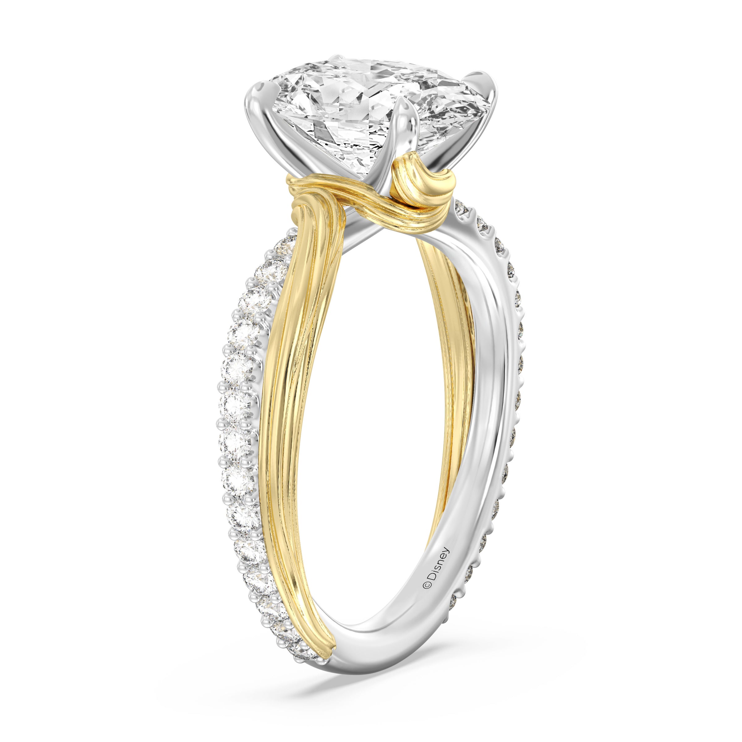 Inspired by Disney Princess Rapunzel’s spirited journey and signature golden braid, this Enchanted Star engagement ring features a brilliant oval lab grown diamond that captures light with every movement. The two-tone 14K gold band weaves together white and yellow gold in a graceful twisted pattern, echoing Rapunzel’s iconic look while symbolizing two paths coming together. Accented with shimmering diamonds along one side of the band, the design blends charm, detail, and modern elegance